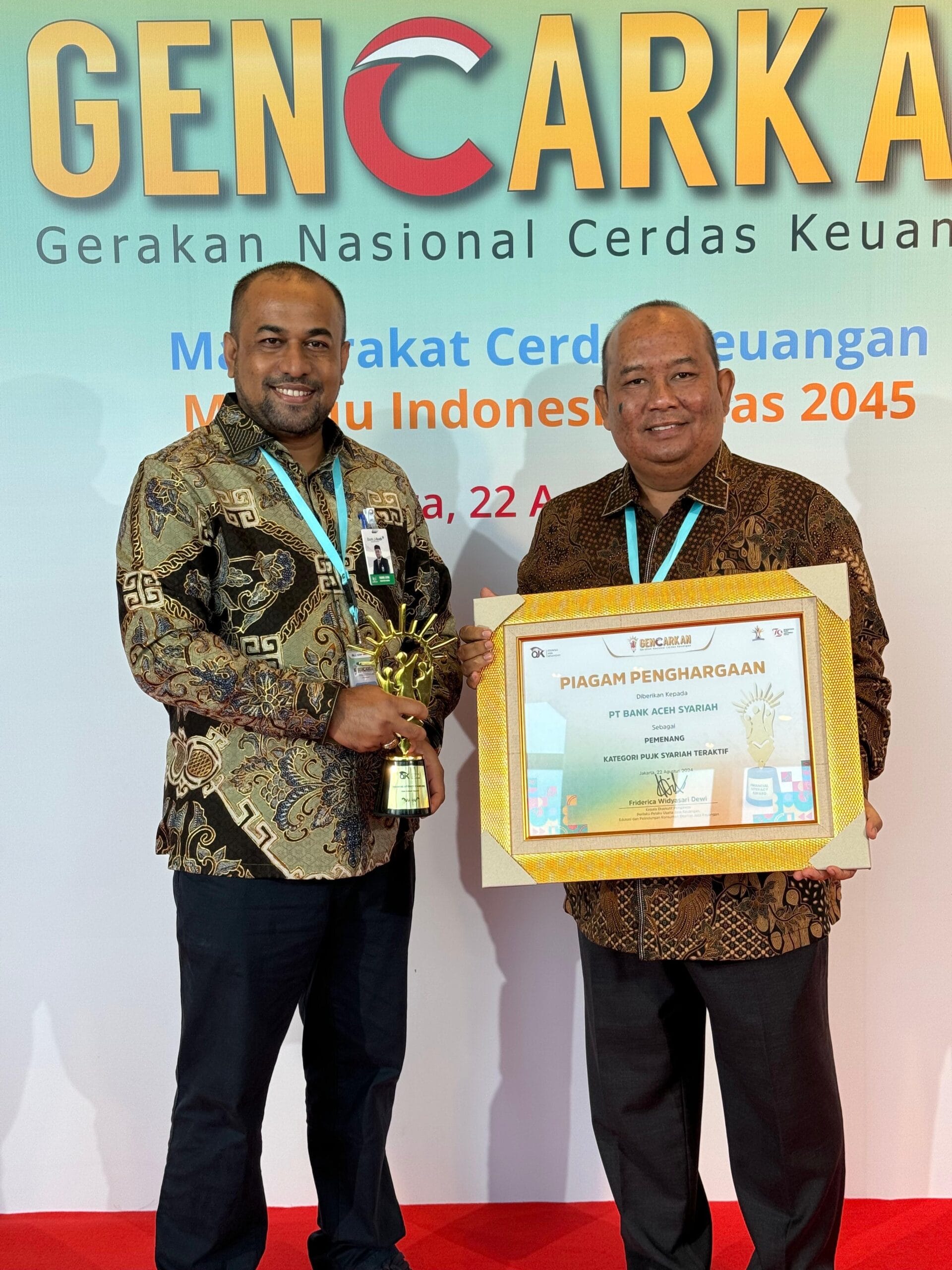 Mahendra Siregar selaku Ketua Dewan Komisioner Otoritas Jasa Keuangan (OJK), Friderica Widyasari Dewi selaku Kepala Eksekutif Pengawas Perilaku Usaha Jasa Keuangan, Edukasi dan Perlindungan Konsumen yang diterima langsung oleh Plt. Direktur Utama Bank Aceh Fadhil Ilyas.