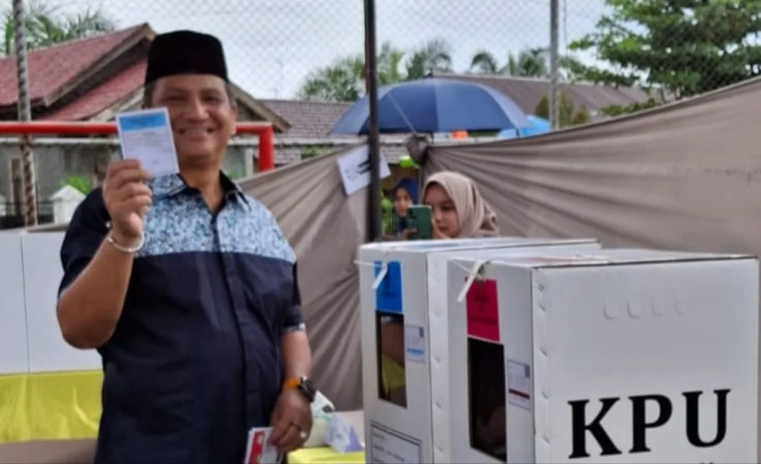 Kualasimpang – Calon Bupati Aceh Tamiang Drs. Armia Pahmi, menyalurkan hak suaranya pada Pemilihan Kepala Daerah (Pilkada) 2024 di Tempat Pemungutan Suara (TPS) 001 Bukit Tempurung, Kecamatan Kota Kualasimpang, Kabupaten Aceh Tamiang, Rabu, 27 November 2024.