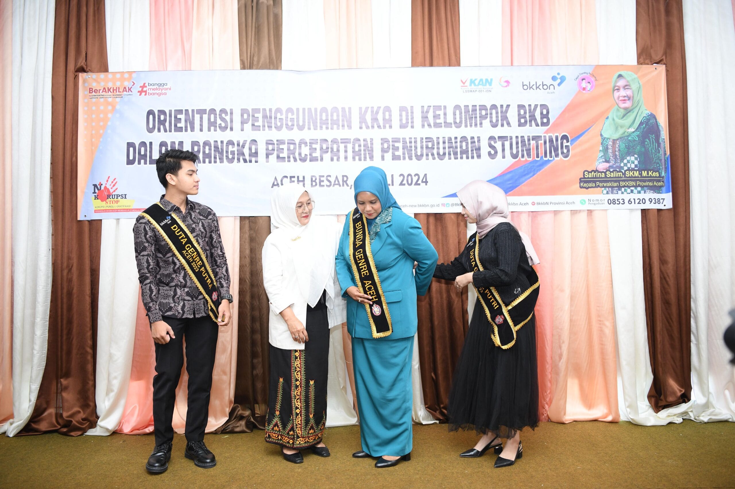 Pengukuhan Mellani Subarni sebagai Bunda GenRe dan Bunda BKB Aceh, ditandai dengan pemasangan selempang yang dilakukan oleh Kepala Perwakilan Badan Koordinasi Keluarga Berencana Nasional (BKKBN) Aceh Safrina Salim. []