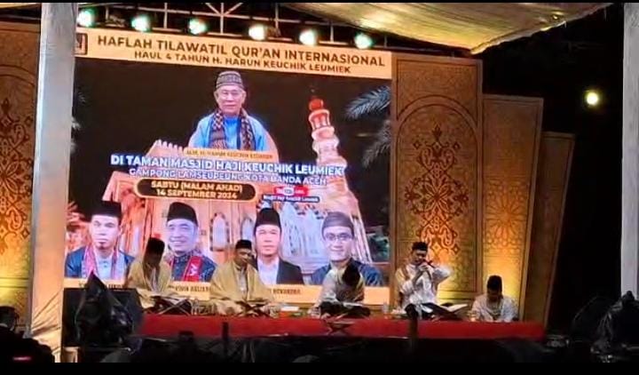 AKTUALNEWS.NET | Banda Aceh – Empat qari internasional memukau hadirin dalam acara Haflah Alquran yang digelar untuk memperingati haul ke-4 H. Harun Keuchik Leumik, pada Sabtu malam (14 September 2024). Acara ini berlangsung di Taman Masjid Haji Keuchik Leumik, Gampong Lamseupeng, Kecamatan Lueng Bata, Banda Aceh.