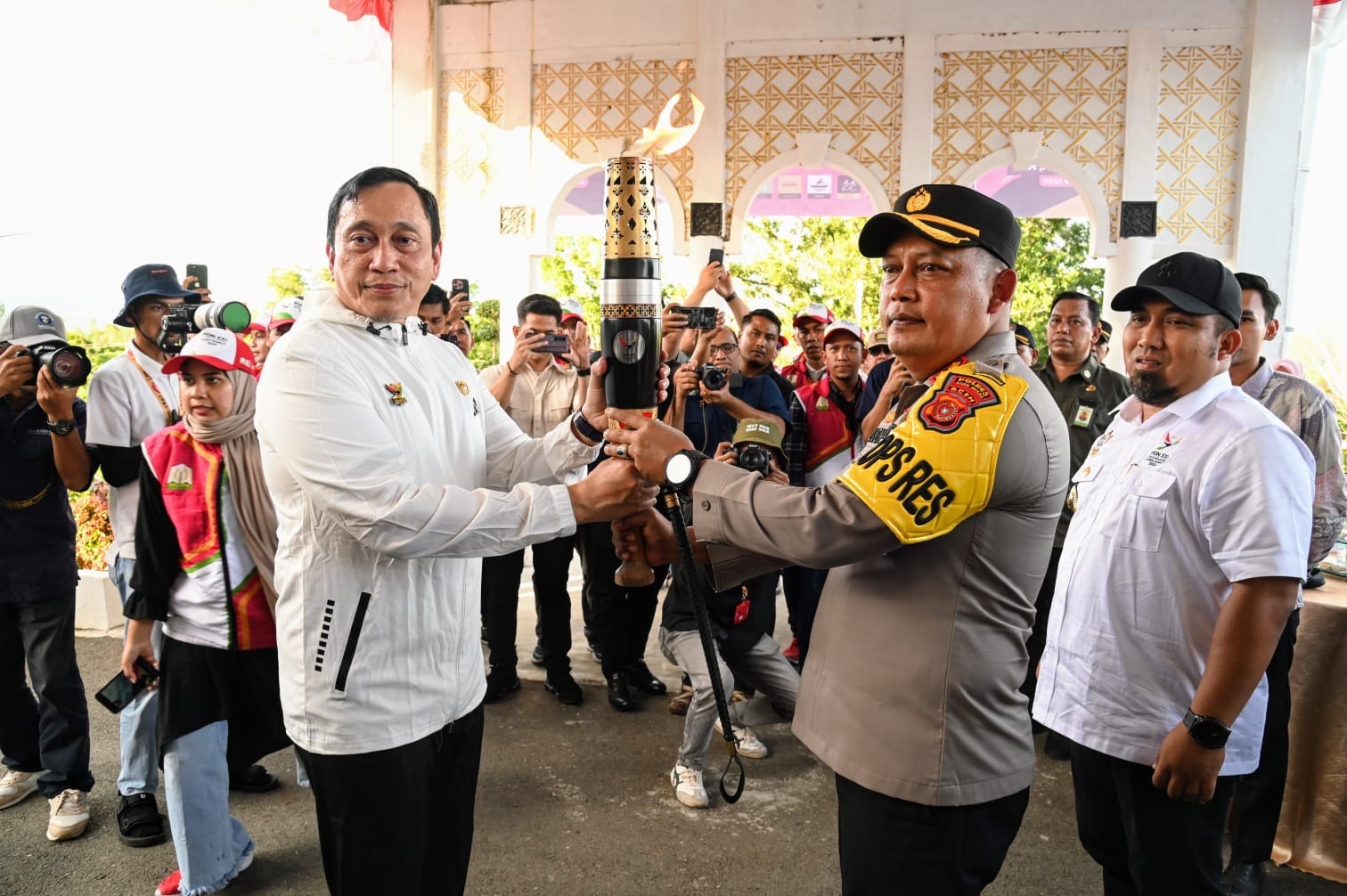 AKTUALNEWS.NET | KOTA JANTHO – Kirab Api Pekan Olahraga Nasional (PON) XXI Aceh-Sumut tahun 2024 tiba di Ibukota Aceh Besar, disambut oleh Pj Bupati Aceh Besar Muhammad Iswanto SSTP MM bersama Forkopimda Aceh Besar di Meuligoe Bupati di Kota Jantho, Kamis (05/09/2024).