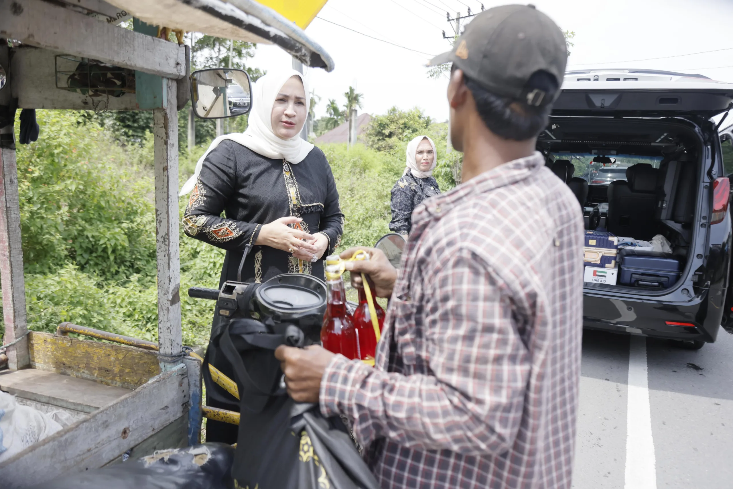 Tanpa ragu, Marlina turun dari mobil, membawa paket sederhana berisi kebutuhan dapur: dua kilogram minyak goreng, dua kilogram gula, satu kotak kurma, dan tiga botol sirup.