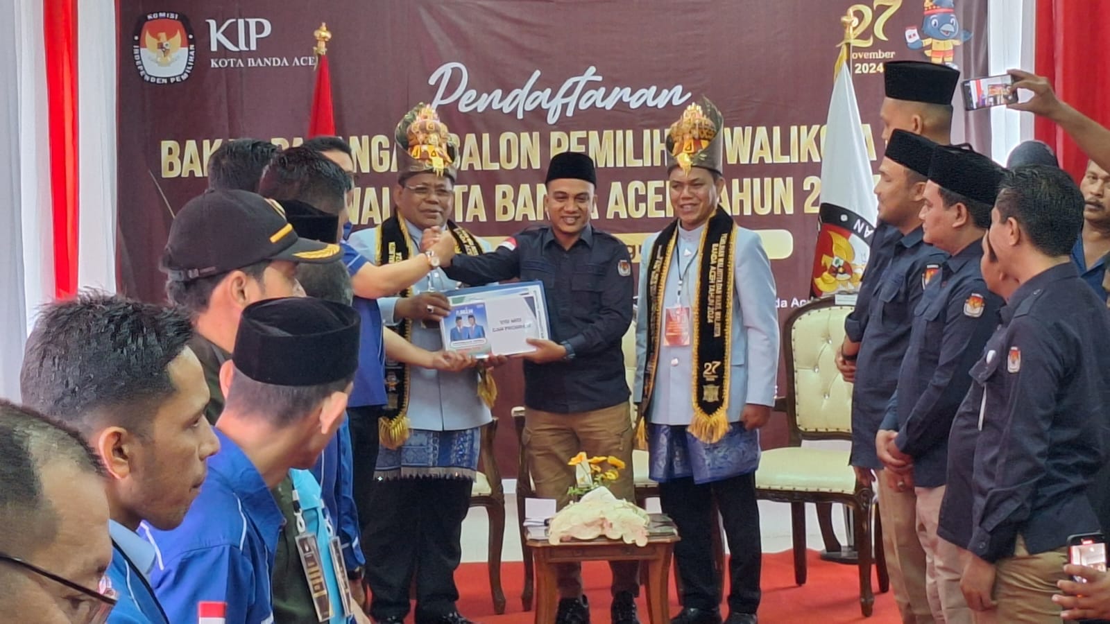 Setibanya di Kantor KIP Banda Aceh, pasangan Aminullah Usman dan Isnaini disambut langsung oleh Ketua KIP Banda Aceh, Yusri Razali, beserta anggota KIP lainnya.