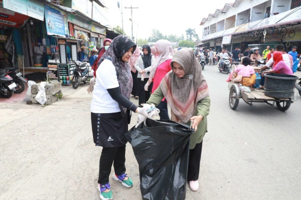 AKTUALNEWS.NET | KOTA JANTHO Penjabat (Pj) Bupati Aceh Besar Muhammad Iswanto S.STP, MM bersama Ketua PKK Aceh Besar Cut Rezky Handayani, S.I.P, MM dan sejumlah Kepala Organisasi Perangkat Daerah (OPD) dan Forum Komunikasi Pimpinan Kecamatan (Forkopimcam) Ingin Jaya kembali melakukan aksi 1 jam memungut sampah di Pasar Induk Lambaro, Kecamatan Ingin Jaya, Sabtu (22/7/2023).