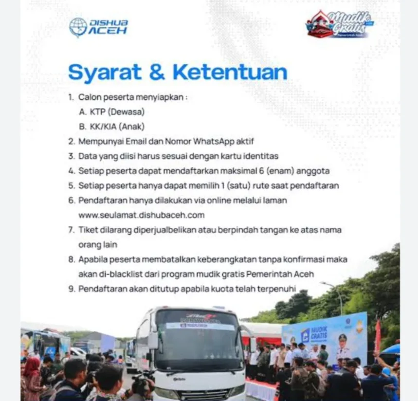 “Kami mengajak masyarakat yang hendak memanfaatkan program mudik gratis agar segera menyiapkan dokumen yang diperlukan dan terus memantau informasi resmi dari Pemerintah Aceh. Cara mendaftarnya cukup mudah,” ujar T. Faisal di Banda Aceh, Jumat, 27/02.