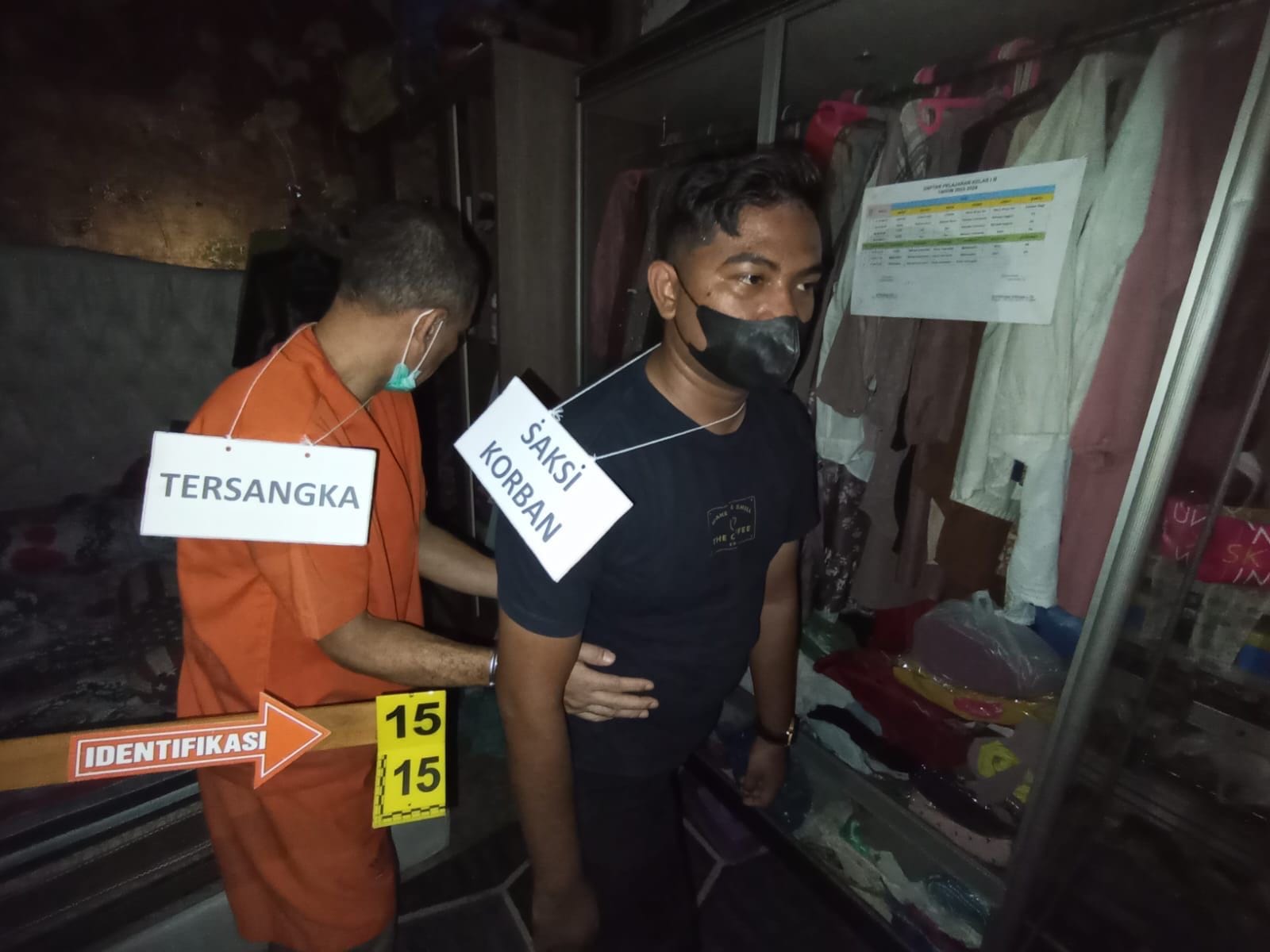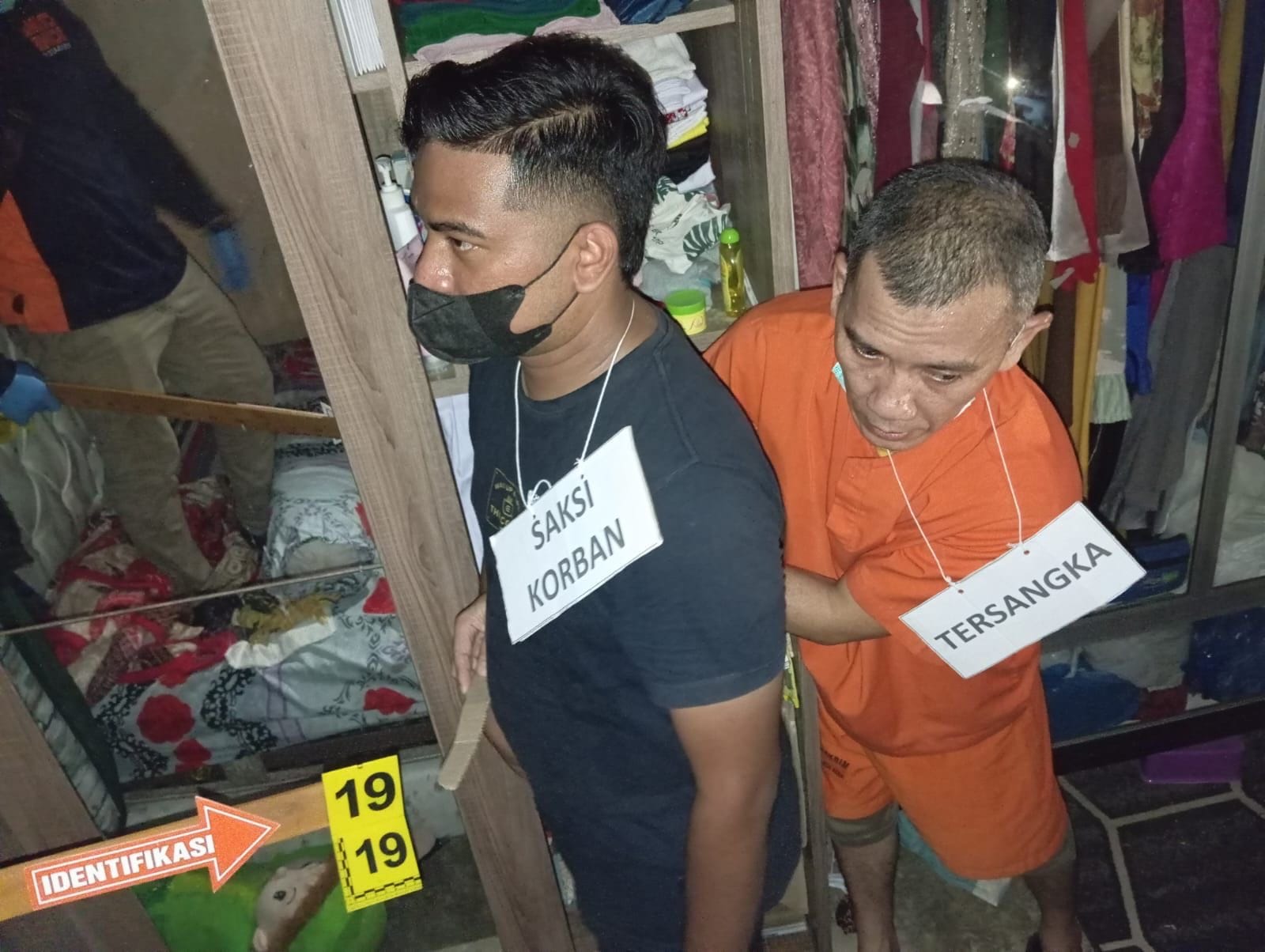 Adegan itu dimulai dari tersangka yang pulang ke istrinya, hingga berlanjut dengan keributan besar antara keduanya dan berujung kepada penganiayaan terhadap korban.