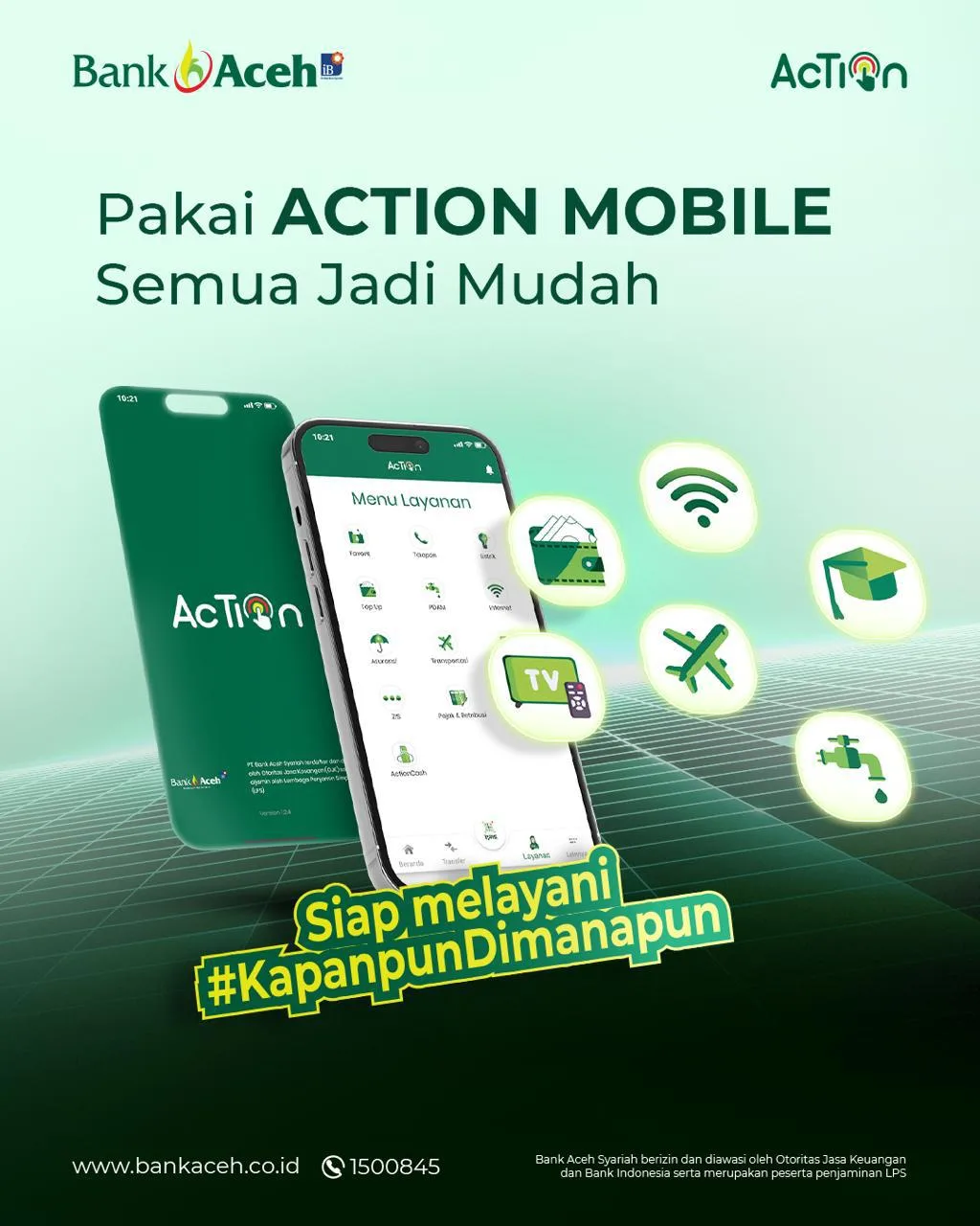 Dengan Action Mobile Bank Aceh nasabah dapat memanfaatkan berbagai transaksi perbankan seperti transfer dana, pembayaran tagihan, top up pulsa. Selain Action Mobile, Bank Aceh juga memiliki layanan digital lainnya seperti Action Bisnis, Action Link, SMS Banking, ATM/CRM, Debit, Action Merchant QRIS dan E-Money Pengcard,” kata Iskandar.