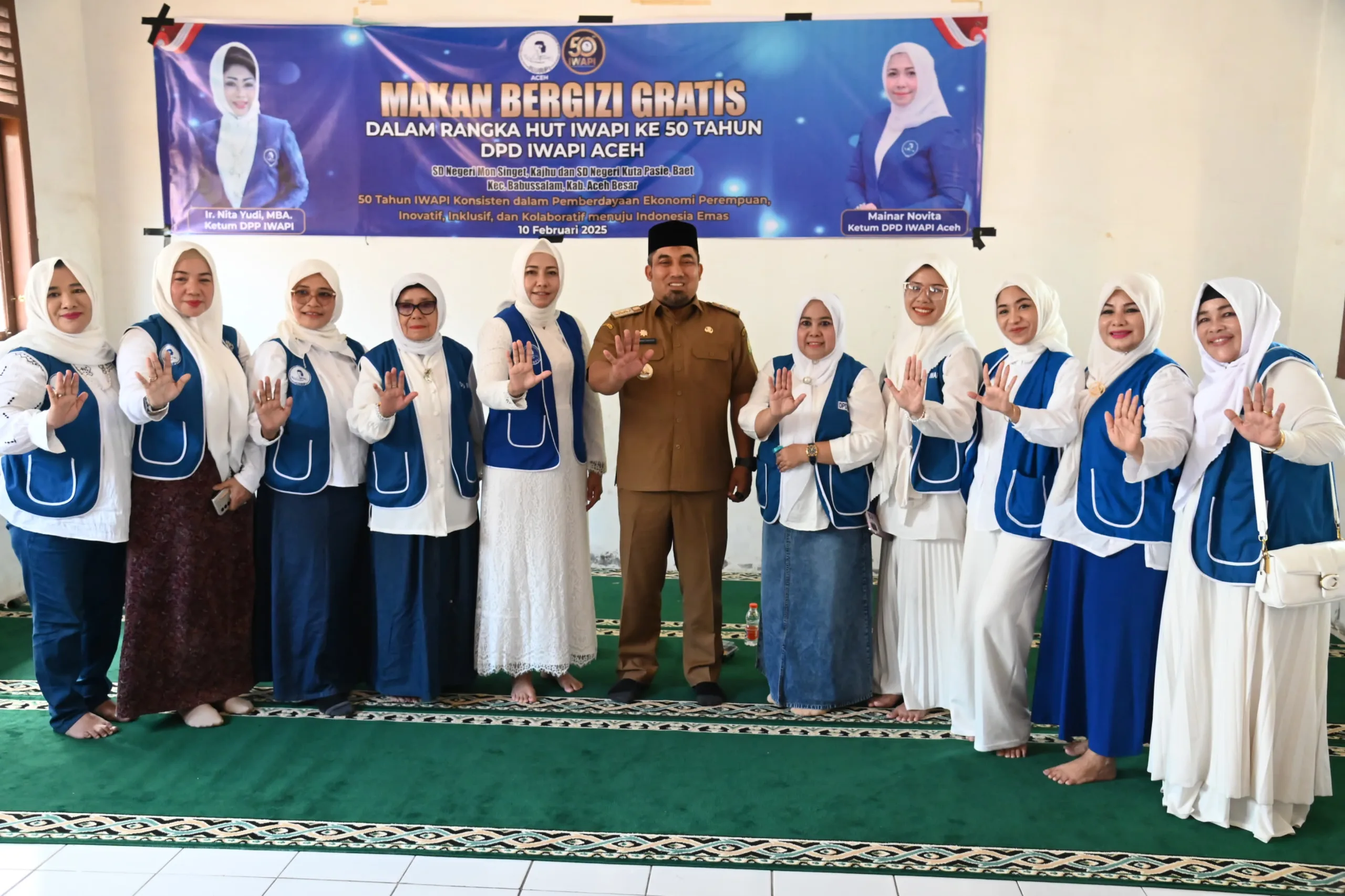 KOTA JANTHO – Dalam rangka memperingati Hari Ulang Tahun (HUT) ke-50 Ikatan Wanita Pengusaha Indonesia (IWAPI), Penjabat Bupati Aceh Besar, Muhammad Iswanto, S.STP, MM, menghadiri seremonial pembagian Makanan Bergizi Gratis (MBG) di SD Negeri Mon Singet, Kajhu, Kecamatan Baitussalam, Aceh Besar, pada Senin (10/2/2025).