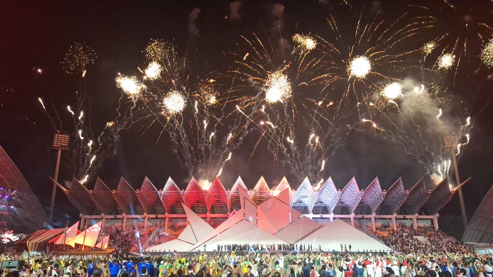 Antusias dan kehebohan para tamu juga tersulut saat beberapa kali kembang api diletuskan hingga membuat suasana dan pemandangan langit dari tribun SHB tampak begitu indah.