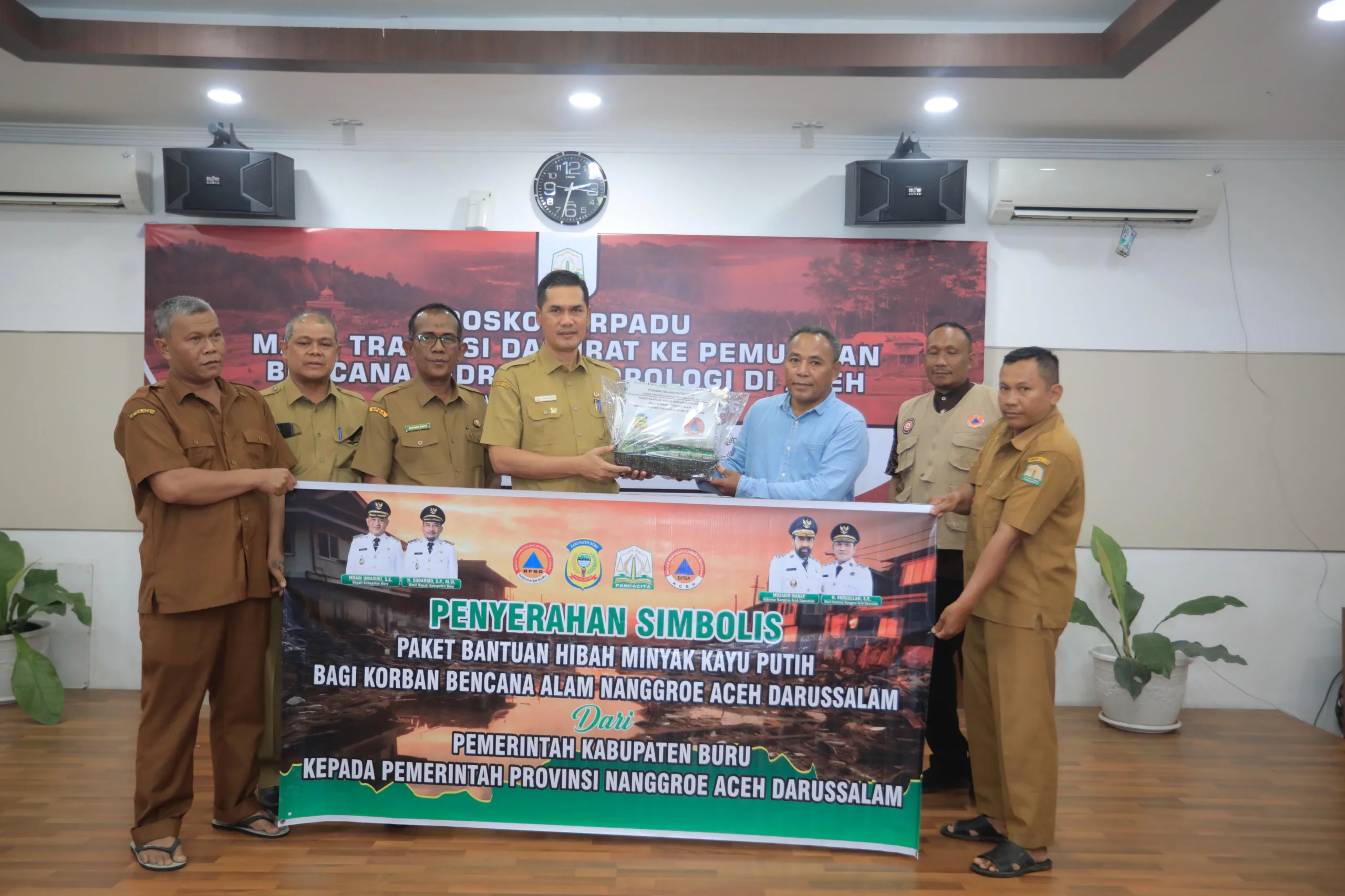 Bantuan berukuran 100 ml per botol tersebut diserahkan secara simbolis oleh Kepala Pelaksana BPBD Kabupaten Pulau Buru, M. TH. Al Affandy, kepada Sekretaris Daerah (Sekda) Aceh, M. Nasir, di Posko Komando Pemulihan Bencana Pemerintah Aceh, Selasa, 21 April 2026.